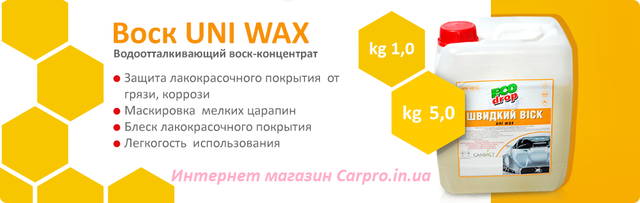 Водовідштовхувальний високоякісний швидкий віск-концентрат для безконтактного полірування. Віск-концентрат Eco Drop "UNI WAX" призначений для оброблення кузова автомобіля після миття. Забезпечує швидке висихання поверхні кузова з полірувальним ефектом, скорочуючи час комплексного оброблення автомобіля.